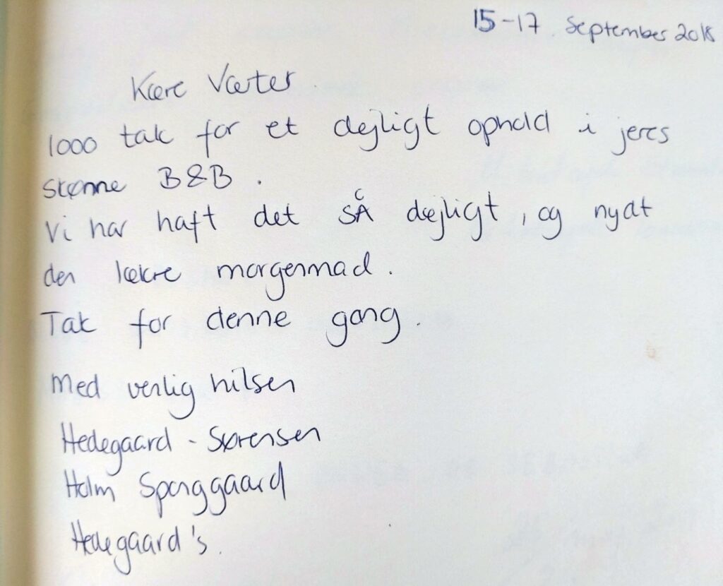 Tak for dejlig overnatning og super dejlig morgenkaffe med friskbagte boller til! Det er et flot og dejligt sted I “gemmer” derude på landet.