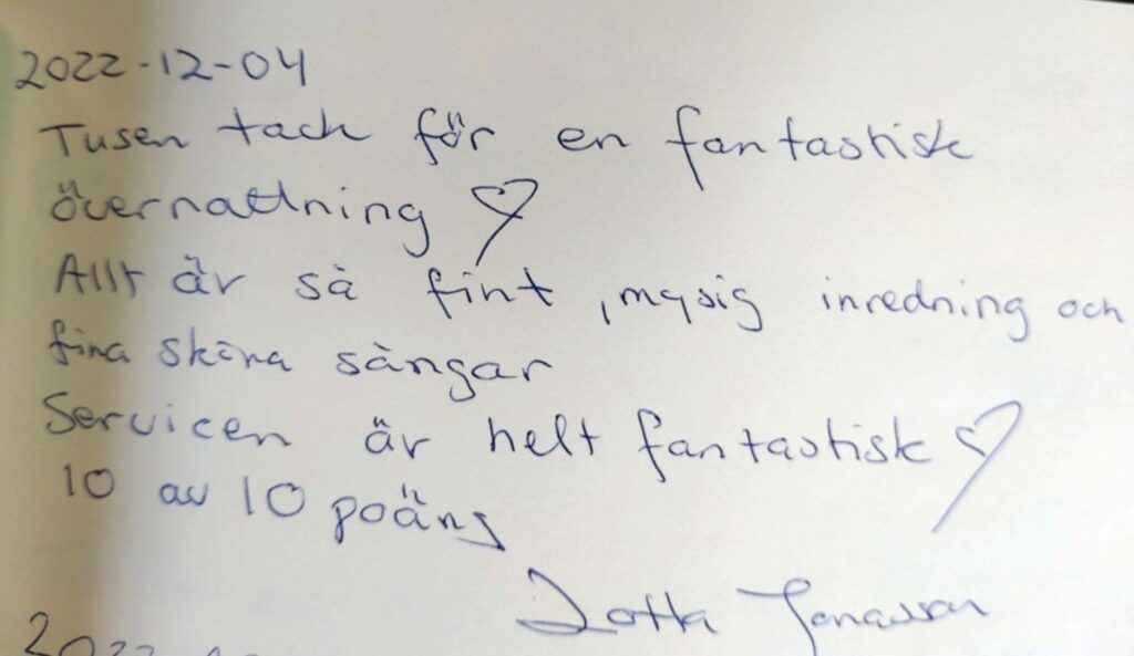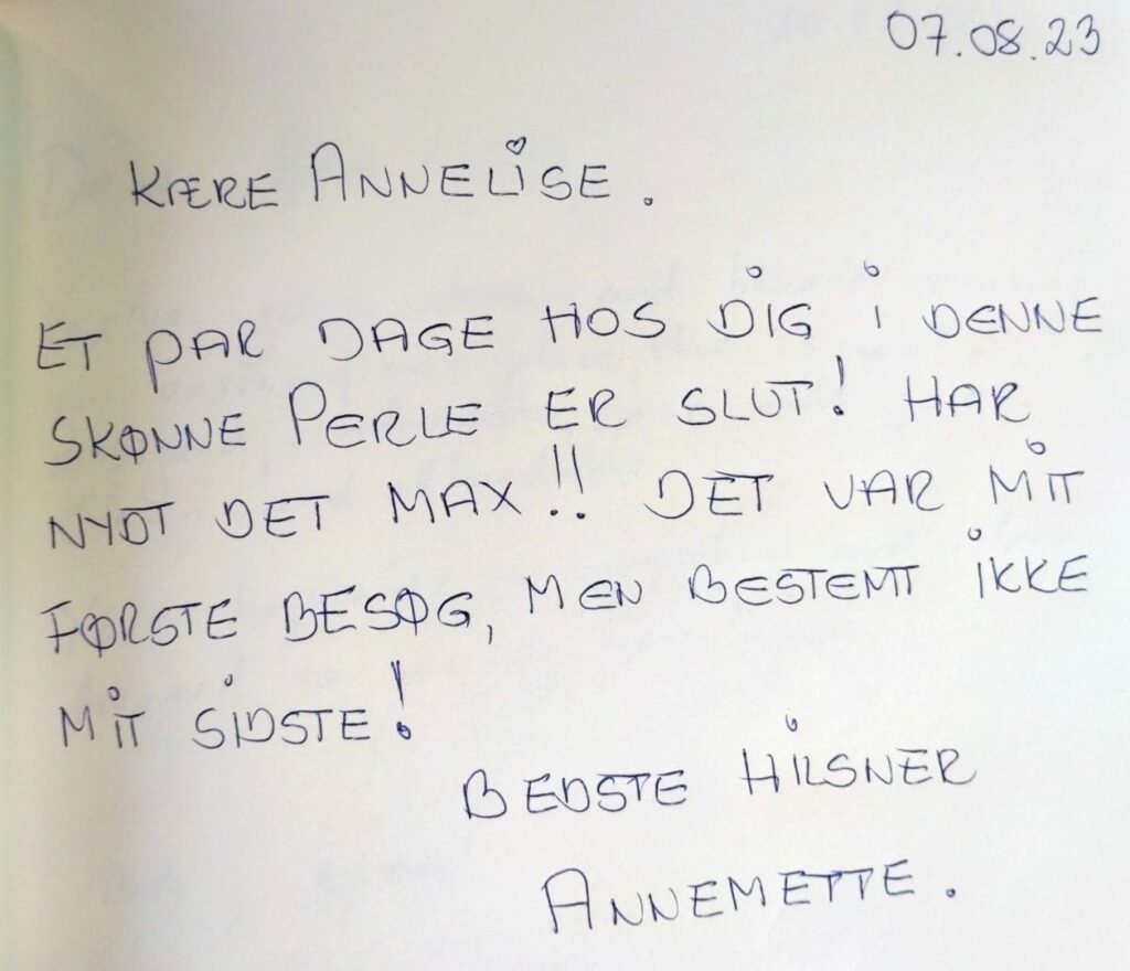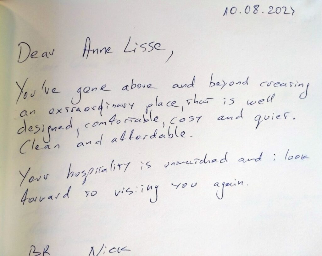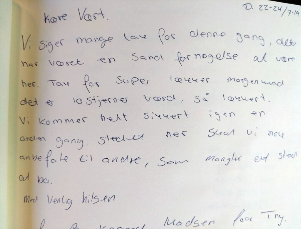 Vores smukke gæstebog vidner om mange skønne oplevelser fra vores gæster. Det er dem, der giver os lyst til fortsat at gøre vores bedste for at skabe rammerne for et dejligt ophold på vores lille stevnske oase. Vi glæder os til også at byde dig velkommen!