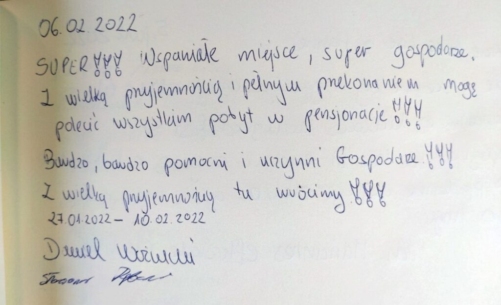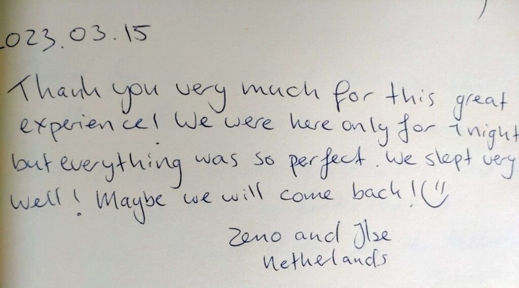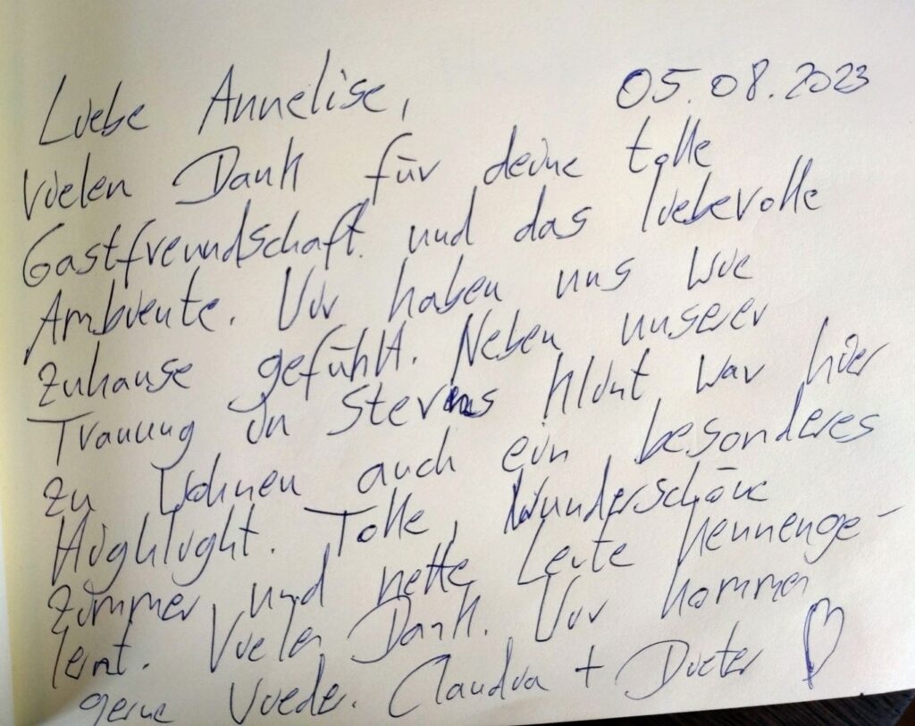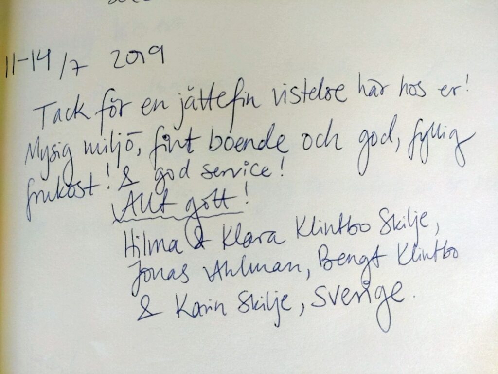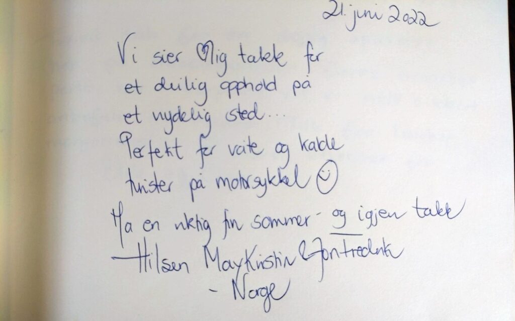 Vores smukke gæstebog vidner om mange skønne oplevelser fra vores gæster. Det er dem, der giver os lyst til fortsat at gøre vores bedste for at skabe rammerne for et dejligt ophold på vores lille stevnske oase. Vi glæder os til også at byde dig velkommen!