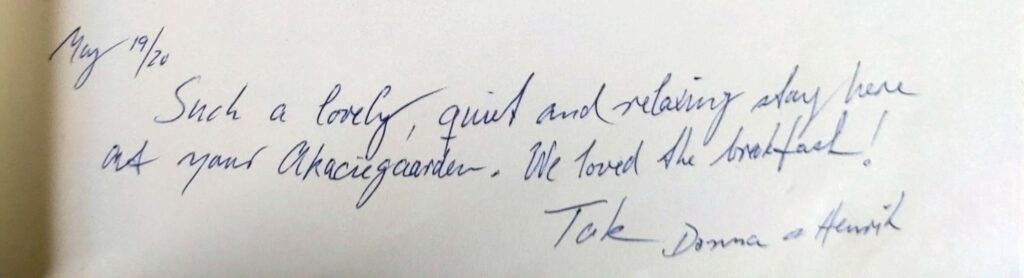 Nåede du ikke at skrive en hilsen i vores fysiske gæstebog, mens du besøgte Akaciegaarden Bed & Breakfast?